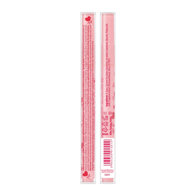 Presiona la punta hasta que salga el producto, dibuja el diseño en la uña y espera unos segundos. Aplica un top coat para mayor duración.