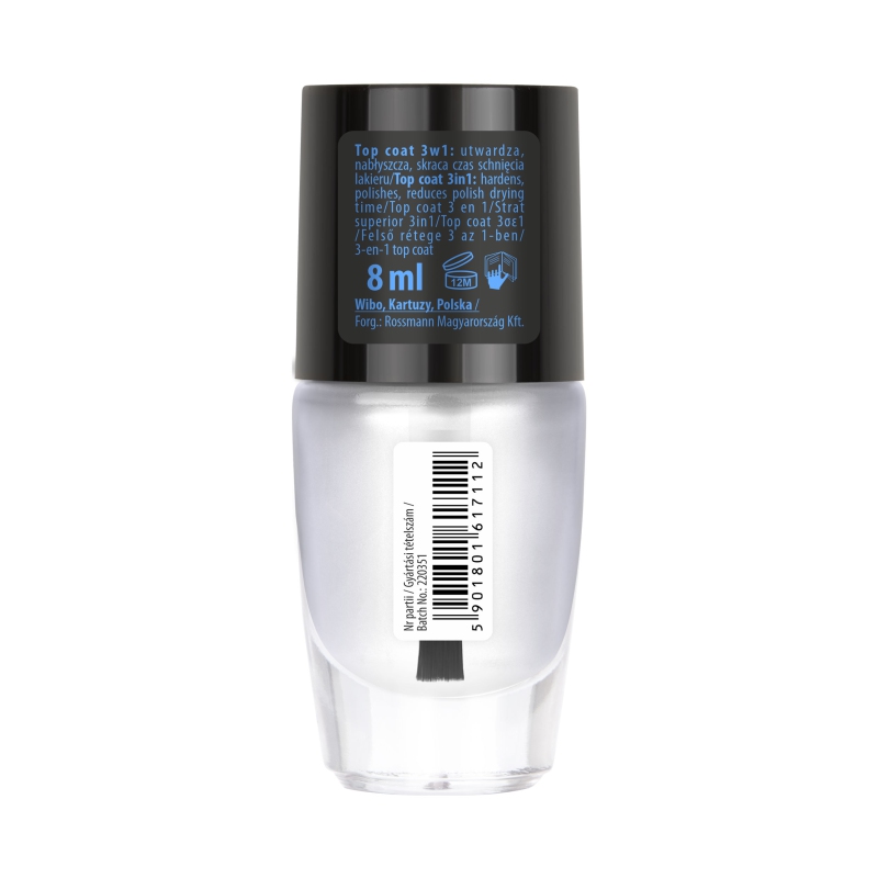3 in 1 Top Coat es un esmalte superior multifuncional que combina tres beneficios clave: refuerza la manicura, añade un brillo intenso y reduce significativamente el tiempo de secado. Con este producto, tus uñas tendrán mayor durabilidad y un aspecto brillante en mucho menos tiempo del habitual.