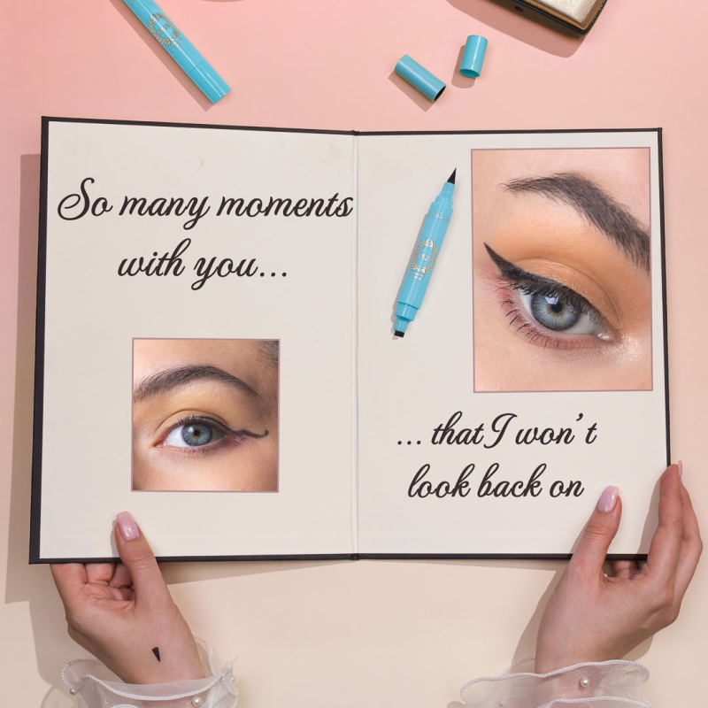 Rajzold meg a tusvonalat a klasszikus applikátorral. Ezután nyomd a bélyegzőt a szem külső sarkához, hogy tökéletes szárnyat hozz létre. Hagyd megszáradni.