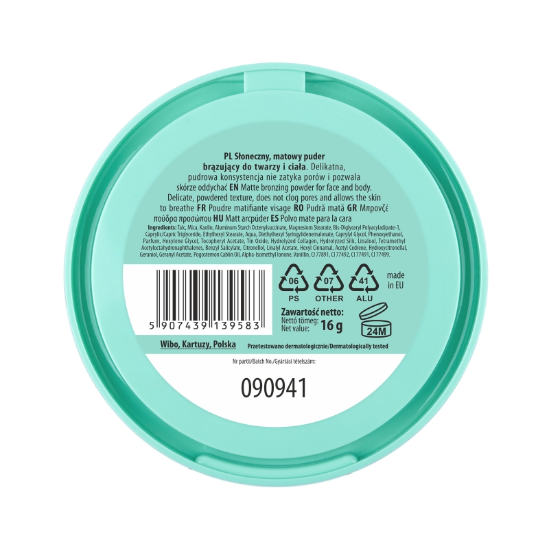 Sunny Powder to wszechstronny puder brązujący do twarzy i ciała, dostępny w czterech wariantach wykończenia: satynowym, z drobinkami złota, z drobinami srebra oraz matowym. Jego delikatna, pudrowa konsystencja pozwala na precyzyjne modelowanie konturów twarzy i naturalne nadanie opalenizny, bez smug czy efektu ciężkości. Formuła nie zatyka porów, dając skórze swobodnie oddychać. Maskuje oznaki zmęczenia, dodając cerze zdrowego, promiennego blasku.