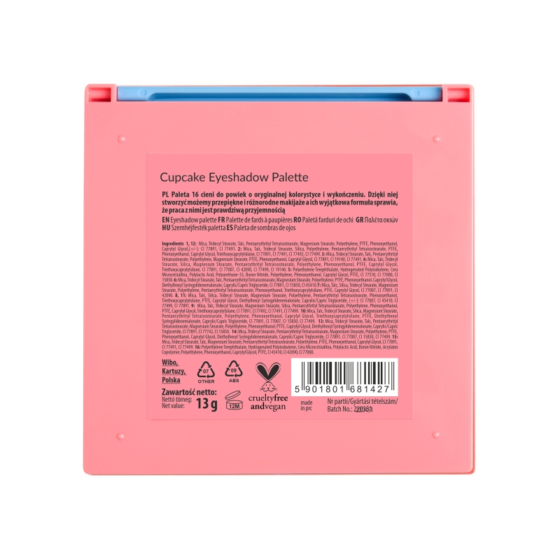 Cupcake Eyeshadow Palette to paleta 16 wyjątkowych cieni do powiek, łącząca szeroką gamę oryginalnych kolorów i różnorodne wykończenia - od matu, przez satynę, po błysk. Każdy cień cechuje się intensywną pigmentacją i aksamitną konsystencją, która łatwo się rozprowadza i blenduje. Dzięki niej stworzysz zarówno delikatne dzienne makijaże, jak i efektowne wieczorowe stylizacje. Paleta inspirowana jest słodkimi, cukierkowymi kolorami, które dodadzą Twoim oczom świeżości i dziewczęcego uroku.