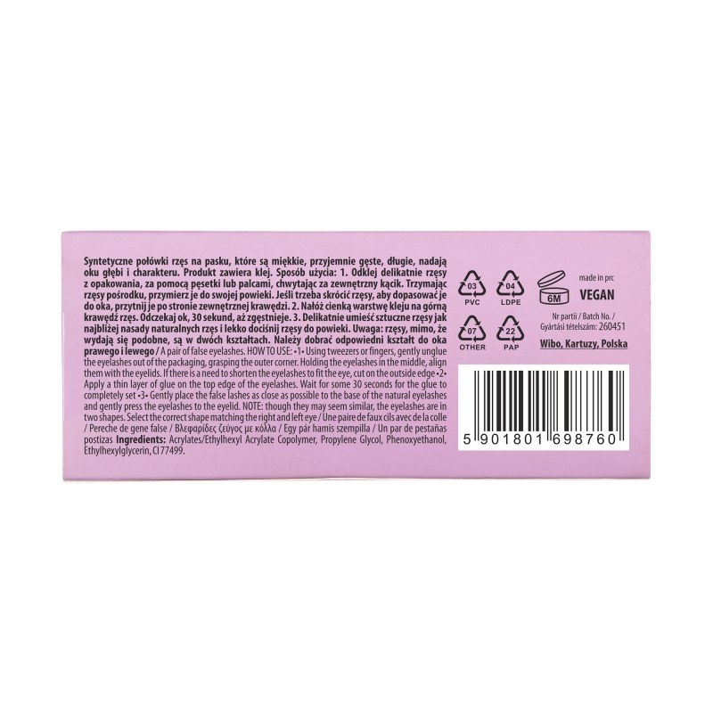 Odklej delikatnie rzęsy z opakowania, chwytając za zewnętrzny kącik. Przymierz do powieki, w razie potrzeby skróć. Nałóż cienką warstwę kleju na górną krawędź rzęs i odczekaj 30 sekund. Przyłóż rzęsy blisko nasady naturalnych włosków i lekko dociśnij.