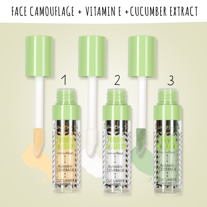 Fresh&Juicy Camouflage to profesjonalny korektor o wysokim kryciu, który skutecznie maskuje niedoskonałości i zmiany pigmentacyjne skóry. Wzbogacony witaminą E i ekstraktem ze świeżego ogórka, łączy pielęgnację z trwałym maskowaniem niedoskonałości. Trzy dostępne odcienie – biały, zielony i różowy – pozwalają idealnie dopasować produkt do indywidualnych potrzeb skóry: biały rozświetla, zielony niweluje zaczerwienienia, a różowy koryguje sine cienie dodając świeżości.