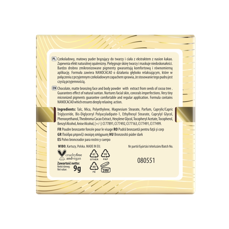 Creamy Chocolate Powder to matowy puder brązujący do twarzy i ciała, który łączy naturalny efekt opalenizny z pielęgnacją skóry dzięki ekstraktowi z nasion kakao. Jego wyjątkowo drobno zmikronizowana formuła zapewnia równomierną i komfortową aplikację, a przyjemny czekoladowy zapach sprawia, że używanie pudru to czysta przyjemność. Puder nie tylko maskuje niedoskonałości, ale także pielęgnuje skórę, zapewniając jej miękkość i zdrowy wygląd.
