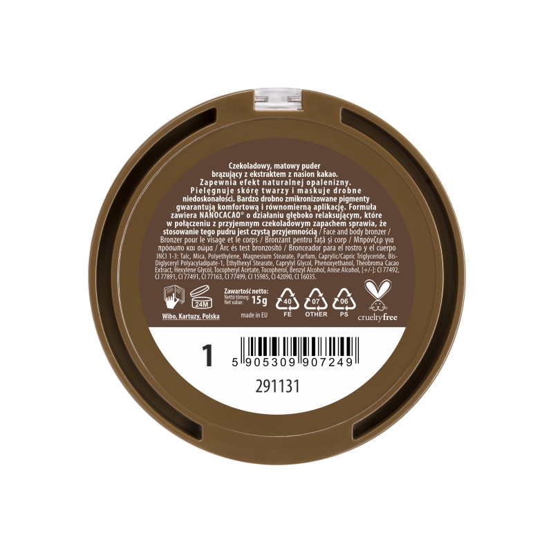 Chocolate Bar Face & Body Bronzer — это матовая бронзирующая пудра шоколадного оттенка для лица и тела, обогащённая экстрактом какао. Формула NANOCACAO® дарит коже глубокое расслабление, а её аромат делает нанесение настоящим удовольствием. Продукт эффективно маскирует мелкие несовершенства, придавая коже естественный и здоровый загар. Доступен в трёх оттенках, адаптированных под разные типы кожи.